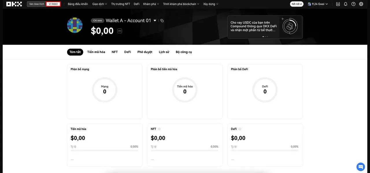 Ví OKX Web3 nổi bật hơn nhiều ví Web3 khác nhờ giao diện trực quan và các tính năng đa dạng. Trang chính của ví cung cấp cái nhìn tổng quan về tài sản, phân bổ mạng lưới, và các danh mục như: