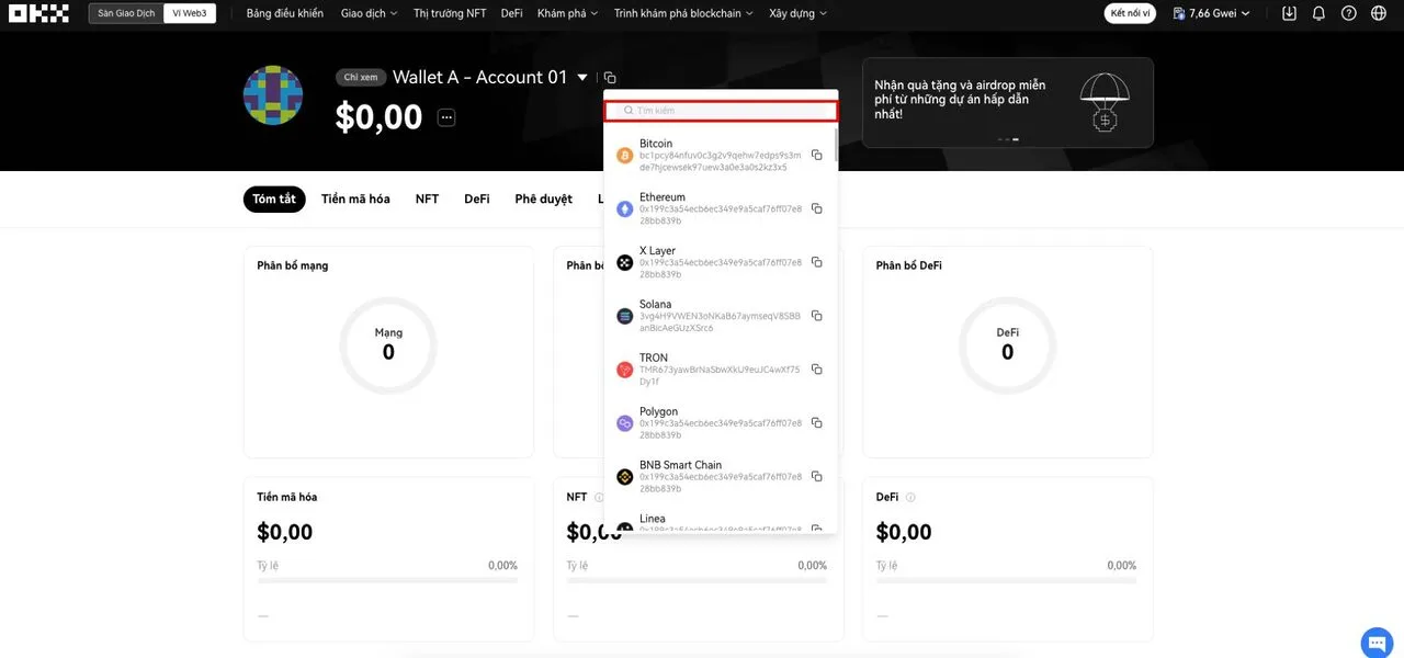 Bước 2: Để deposit tài sản, người dùng chỉ cần nhấn vào biểu tượng đỏ để xem địa chỉ ví trên các chain mà ví OKX Web3 hỗ trợ.