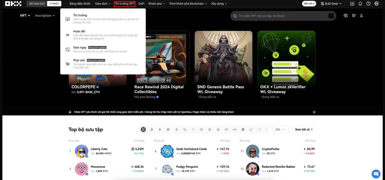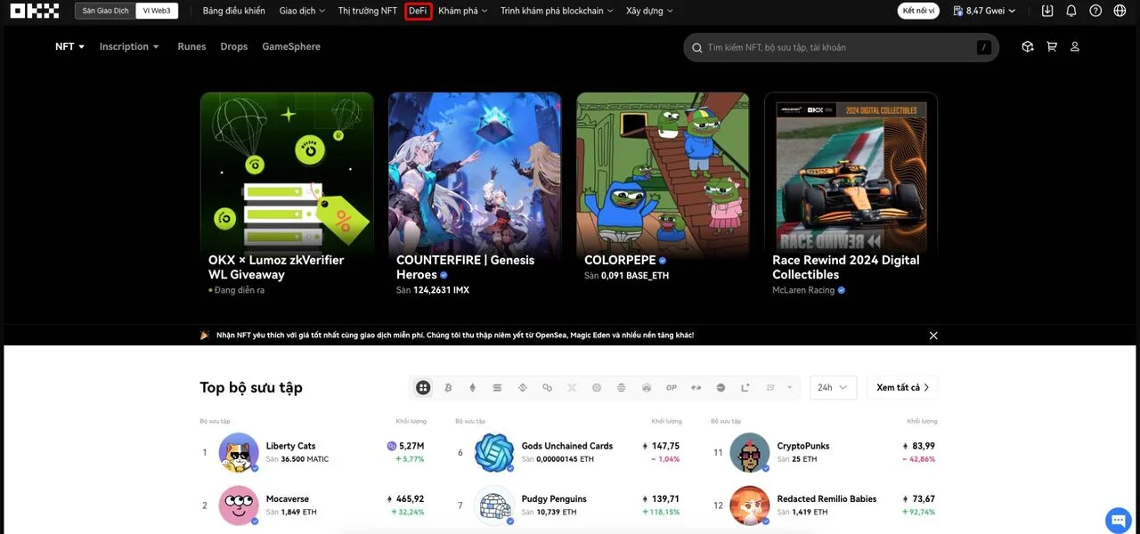 Tính năng OKX NFT giúp người dùng quản lý NFT dễ dàng và hiệu quả, đồng thời cập nhật liên tục các bộ sưu tập NFT theo khối lượng giao dịch 24h để theo dõi xu hướng thị trường. Người dùng có thể sử dụng Ordinals để khắc dữ liệu trên 21 blockchain (bao gồm BRC-20), kiểm tra airdrop trong mục Drops, và mint NFT miễn phí.