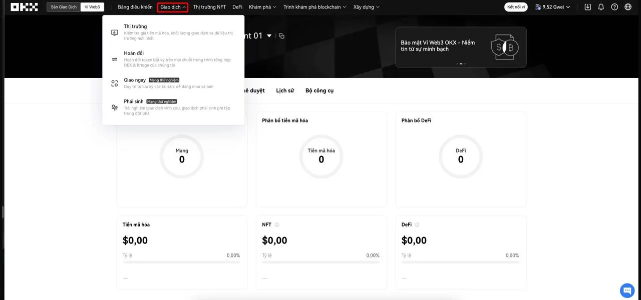 Bước 3: Để swap hoặc bridge token, người dùng nhấp vào mục Giao dịch. Các mục Thị Trường NFTDeFi cung cấp sản phẩm cần thiết cho người dùng trên OKX Web3.