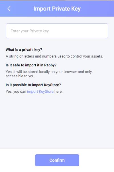 4.  Nhập Private Key, bấm “Confirm”. Đặt tên ví, bấm “Done”.