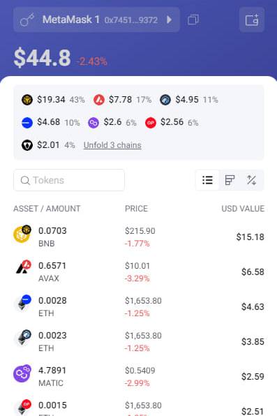 Khi kết nối ví MetaMask với Rabby Wallet xong, người dùng có thể theo dõi tài sản của mình từ MetaMask trên Rabby.