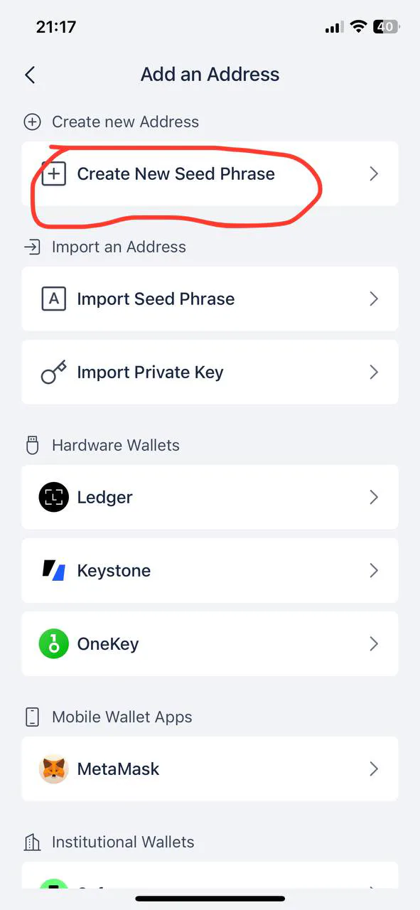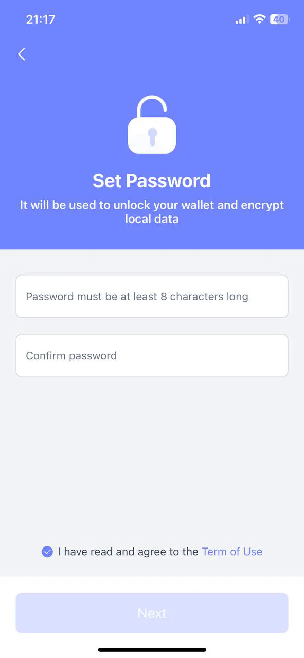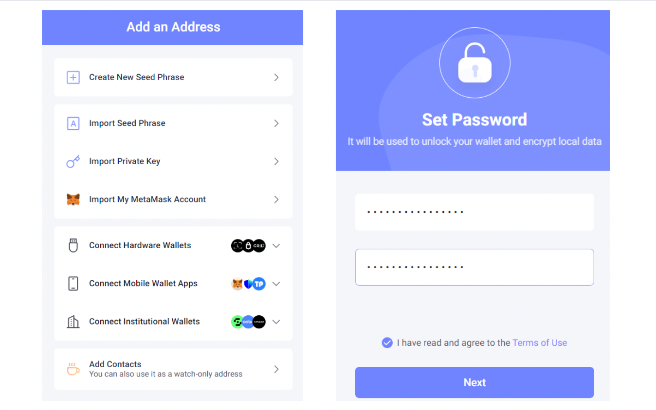 Để tạo ví mới, bấm “Create New Seed Phrase”, tạo mật khẩu, rồi bấm “Next”.