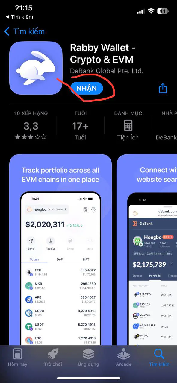 Bước 2: Bấm “Nhận” để tải Rabby Wallet về thiết bị -> Trong giao diện ứng dụng bấm “Next