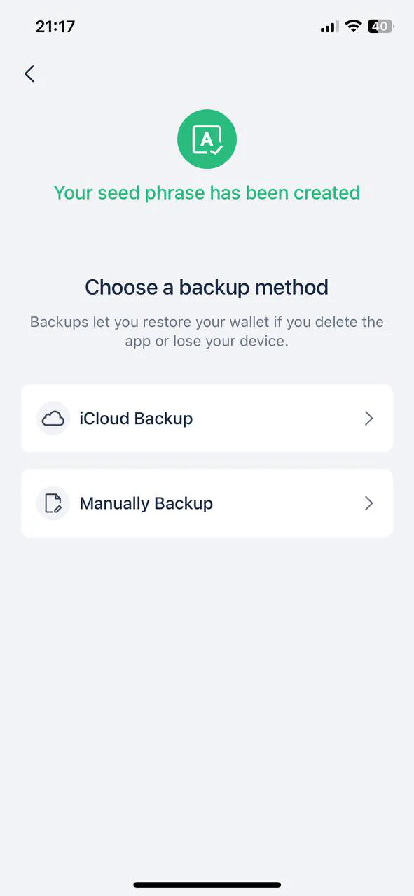 Bước 4: Sau khi tạo ví, sao lưu Seed Phrase – cụm từ khôi phục giúp đăng nhập lại ví nếu quên mật khẩu. Không chia sẻ cụm từ này để bảo vệ tài sản.