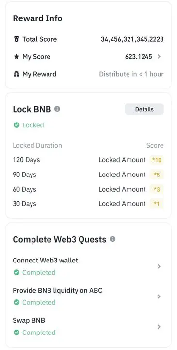 Số điểm thưởng nhận được phụ thuộc vào số lượng BNB được mang đi đăng ký và khoá. Kỳ hạn càng dài thì điểm nhận được càng cao.