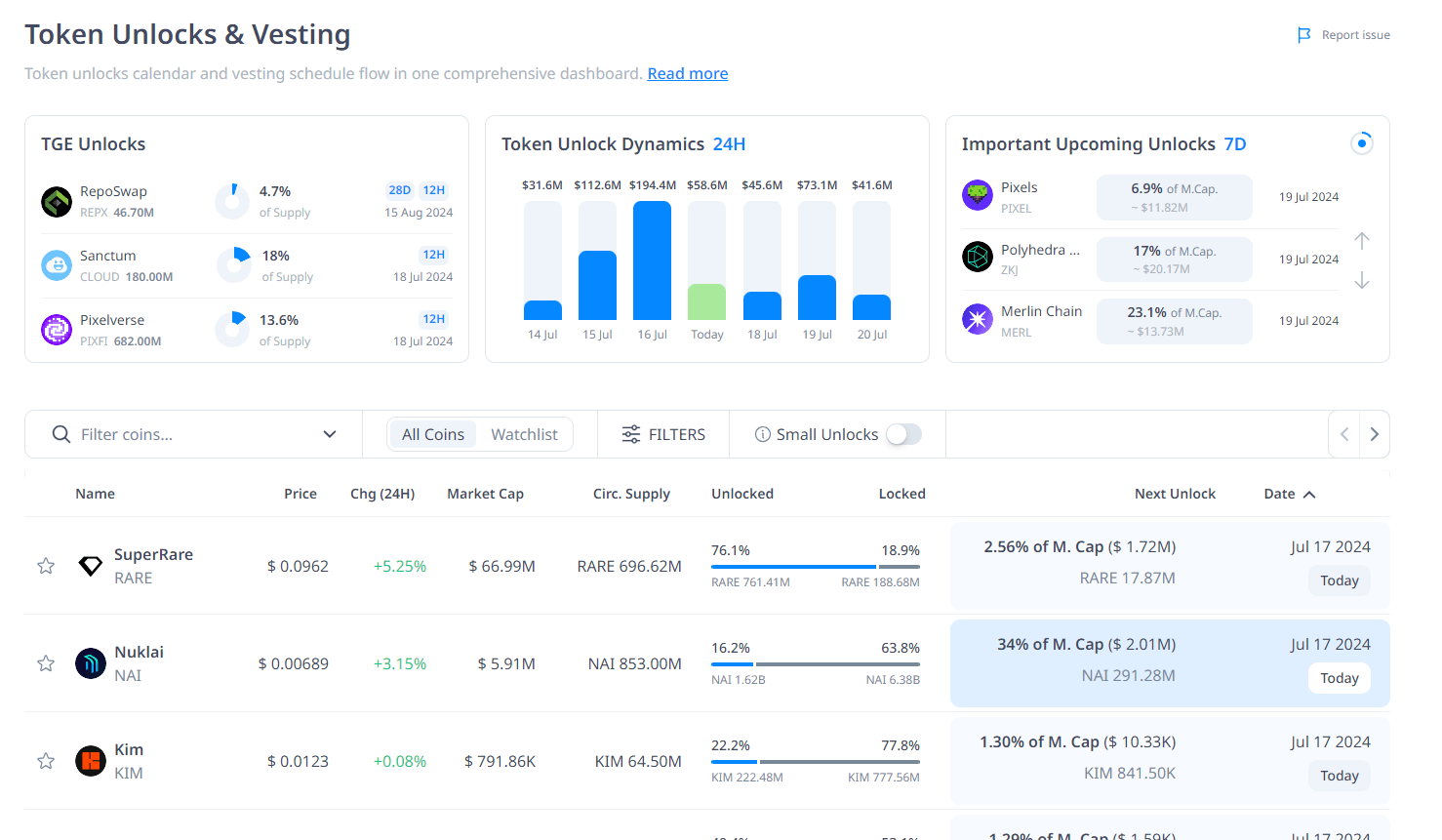 Tính năng này cung cấp thông tin về các đợt mở khóa token của các dự án như thời gian mở khóa, khối lượng mở khóa,….