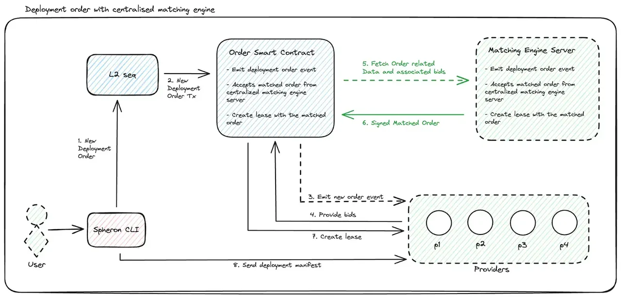 Sau khi ghép nối, hợp đồng thông minh sẽ tạo hợp đồng thuê với nhà cung cấp. Người dùng sau đó gửi bản kê khai để triển khai khối lượng công việc qua kết nối MTLS, và có thể kiểm tra trạng thái cũng như truy cập các thông tin triển khai như URL và cổng kết nối.