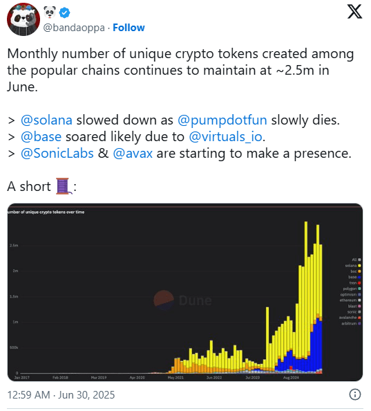 Trong tháng này, hơn 2,5 triệu token mới được tạo ra trên các blockchain lớn như Ethereum, Solana và Base.
