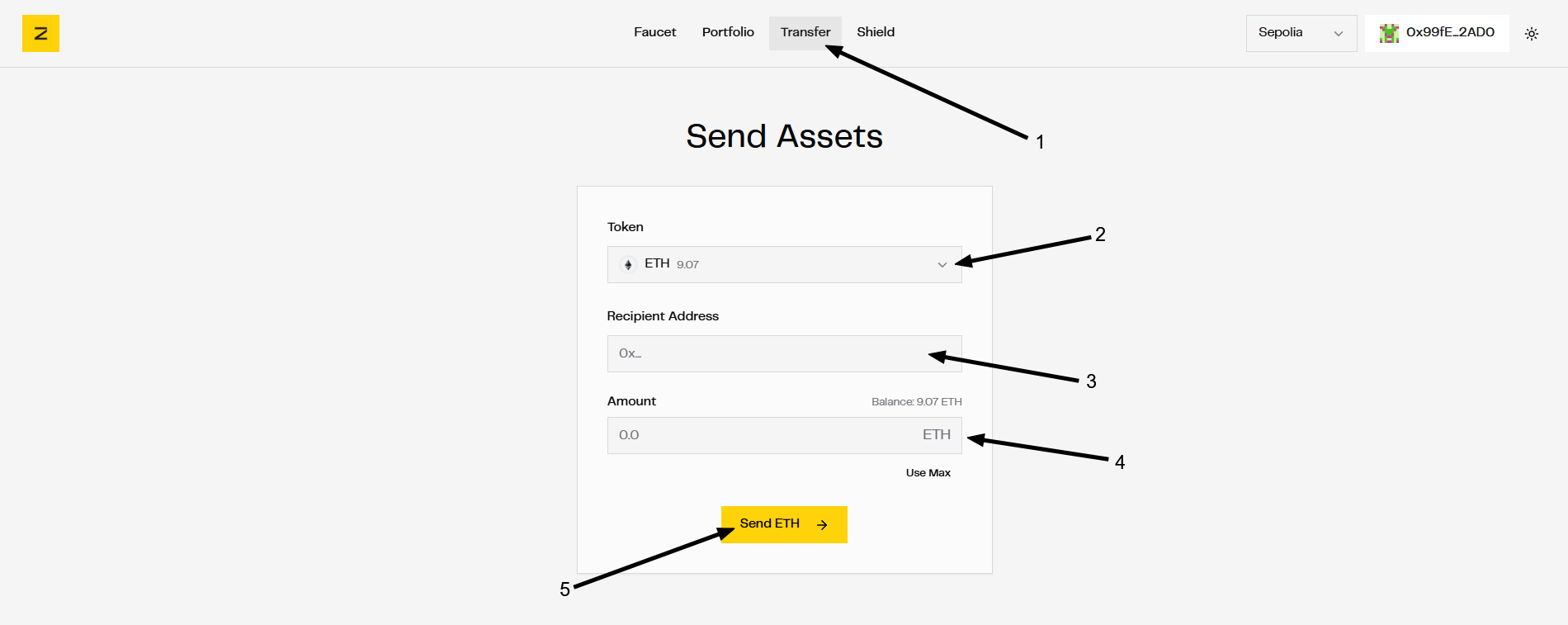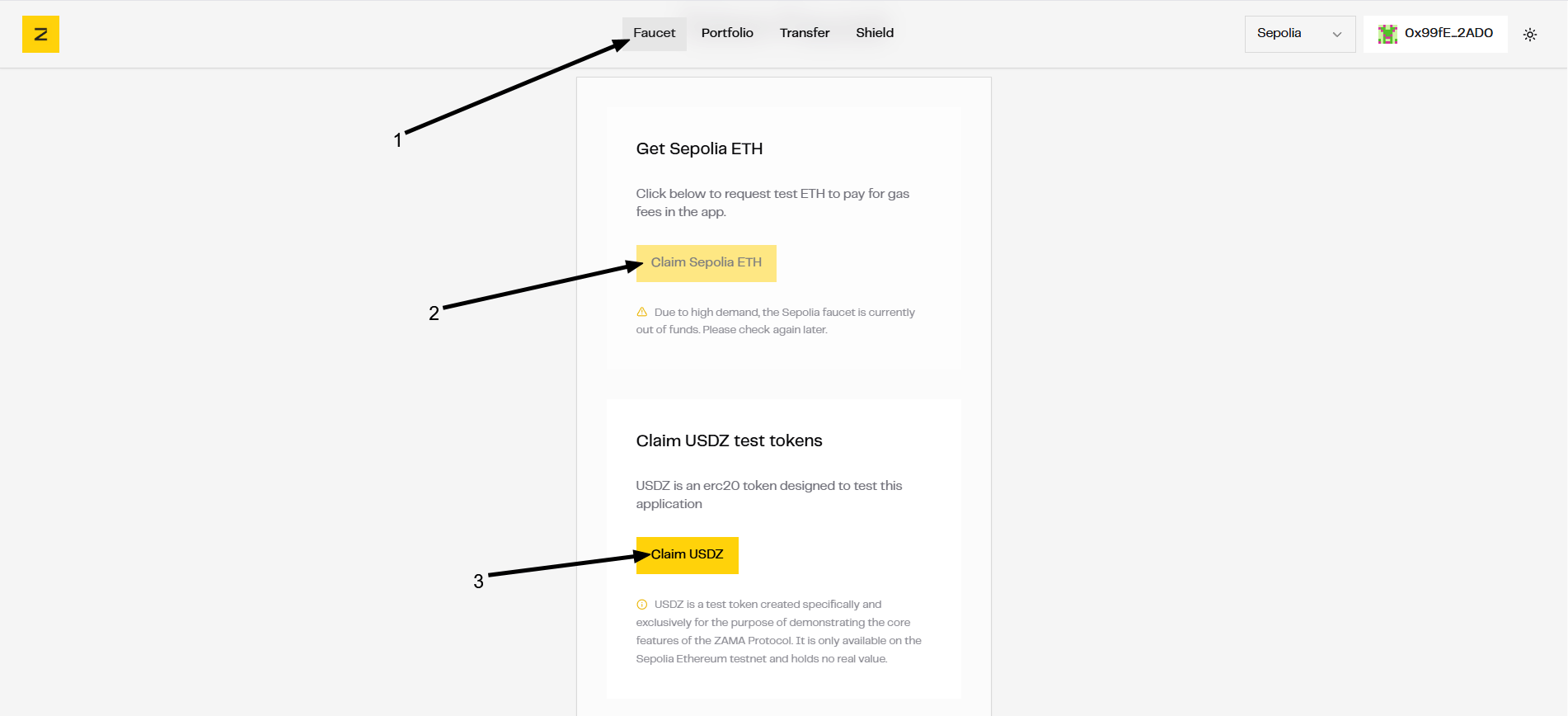 Bước 2: Vào mục Faucet để nhận token testnet $ETH$USDZ; nếu nút nhận ETH không dùng được, hãy dùng faucet của Alchemy hoặc Infura.