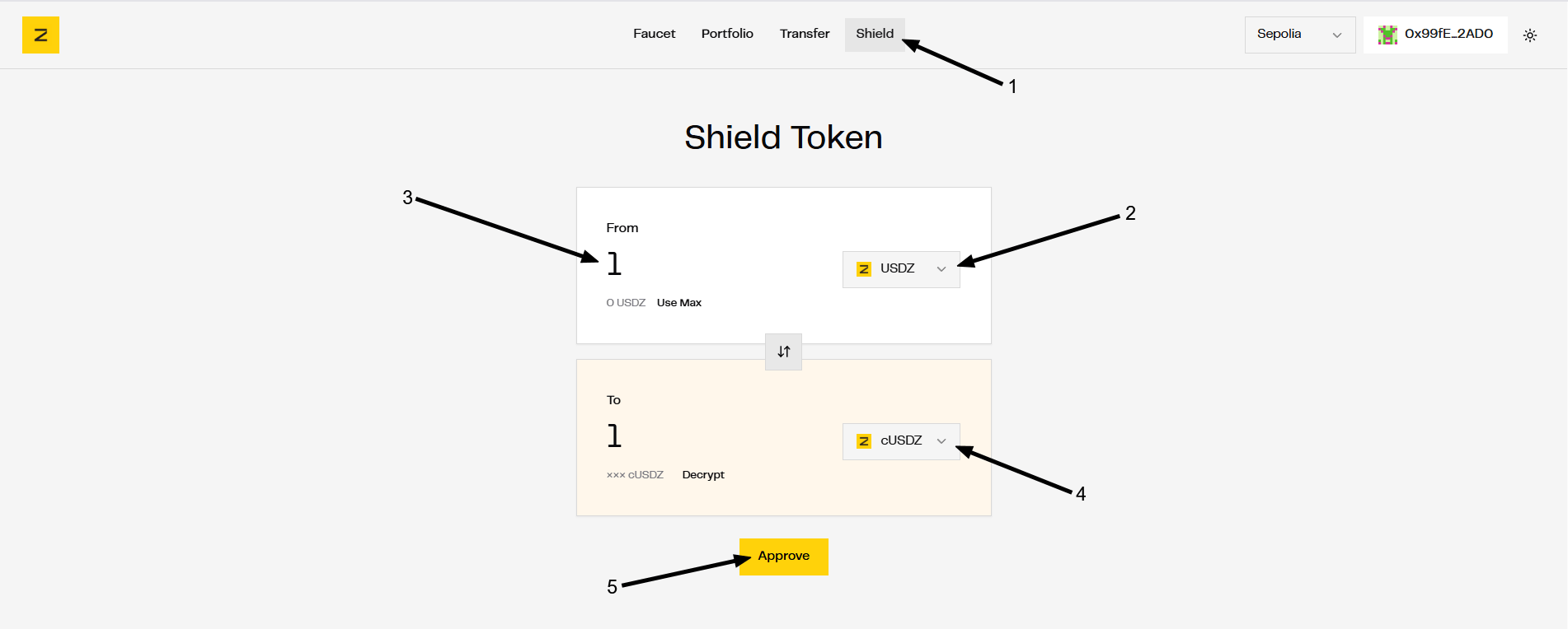 Bước 4: Chọn mục Shield -> Swap qua lại giữa USDZ và cUSDZ -> Approve để chấp thuận giao dịch.