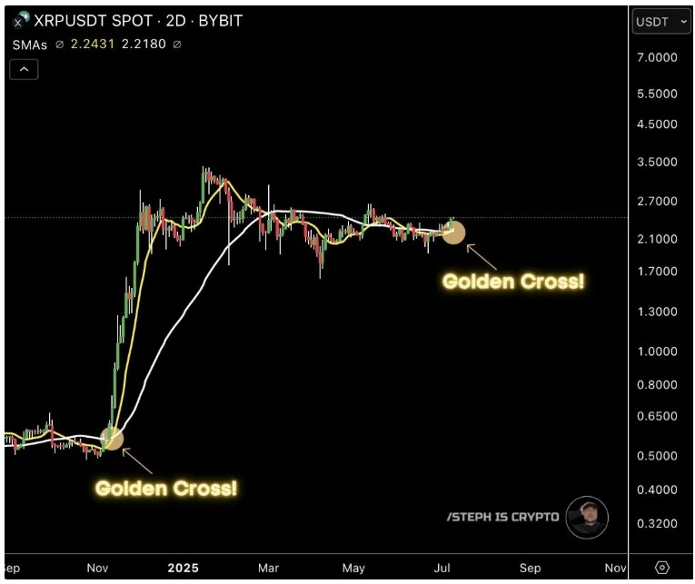 Một người dùng trên nền tảng, có tên Steph Is Crypto, đã chia sẻ biểu đồ thể hiện hiện tượng “golden cross” (giao cắt vàng) của XRP — một tín hiệu truyền thống cho thấy xu hướng tăng tiếp diễn. Một số người khác thậm chí dự đoán XRP sẽ vươn tới mức 4 USD ngay trong tháng 7 này.