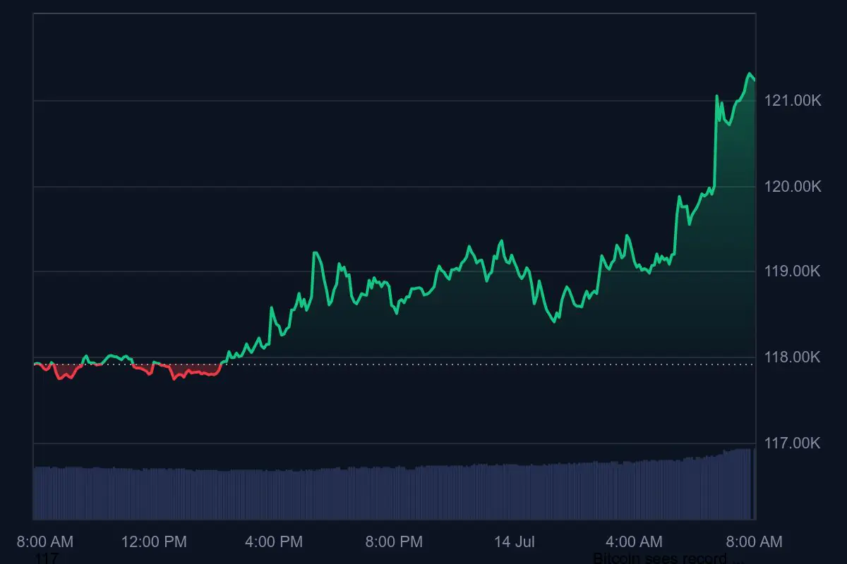 Bitcoin đạt mức cao kỷ lục mới 121.300 USD vào ngày 14/7, tăng 2,93% trong 24 giờ, nhờ lực mua từ doanh nghiệp, dòng vốn ETF mạnh và tín hiệu kỹ thuật tích cực.