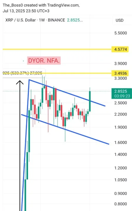 Nhà phân tích “The Boss” tin tưởng vào kịch bản này, chia sẻ trên Twitter rằng XRP đang thể hiện xu hướng tăng trên biểu đồ tuần. Cụ thể, XRP đã tăng gần 30% trong 7 ngày qua, phá vỡ mô hình “cờ tăng” – một tín hiệu tích cực trong phân tích kỹ thuật.