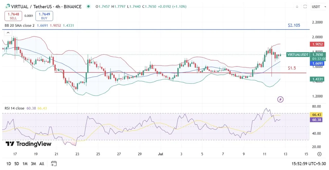 Về mặt kỹ thuật, biểu đồ 4 giờ cho thấy sự củng cố đang diễn ra sau mức cao gần đây là 1,87 đô la, với giá hiện tại quanh mức 1,776 đô la. Chỉ số RSI hiện ở mức 61,20, cho thấy vẫn còn dư địa để tăng trước khi rơi vào trạng thái quá mua. Dải Bollinger đang mở rộng, thường là dấu hiệu báo trước biến động, và giá hiện đang dao động quanh dải trên, cho thấy đà tăng mạnh.