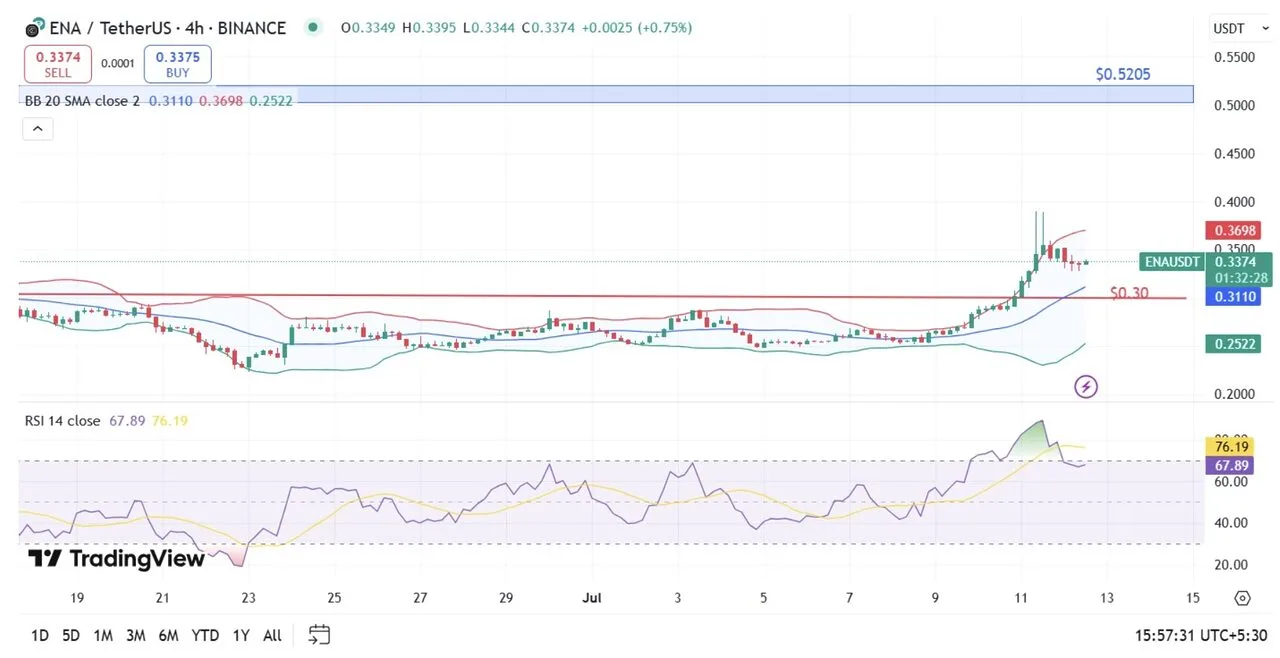 Diễn biến giá trên biểu đồ 4 giờ cho thấy sự tích lũy lành mạnh quanh đường SMA 20 ở mức 0,3112 đô la, cho thấy sự tích lũy tại ngưỡng hỗ trợ. Với nền tảng vững chắc và mức tăng 31,96% gần đây trong 7 ngày, Ethena được dự đoán sẽ phục hồi về mức 0,70 đô la hoặc cao hơn. Rủi ro giảm giá tiềm ẩn được giới hạn ở mức 0,30 đô la, với mức giá trung bình quanh 0,52 đô la và mức cao nhất có thể là 0,95 đô la nếu tâm lý thị trường tiếp tục mạnh lên.