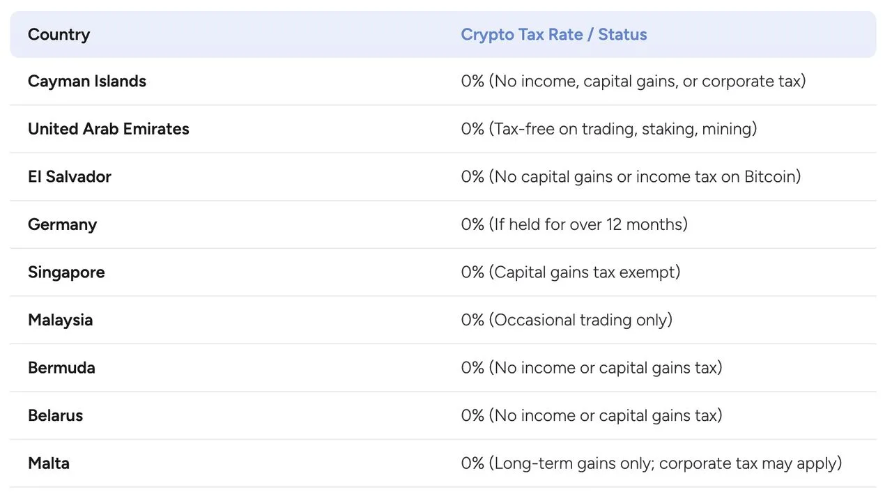 Năm 2025, ngày càng nhiều quốc gia thắt chặt chính sách thuế đối với tiền điện tử. Tuy nhiên, một số quốc gia thân thiện với tiền điện tử vẫn tiếp tục áp dụng chế độ miễn thuế, thu hút các nhà đầu tư nghiêm túc và các công ty Web3.