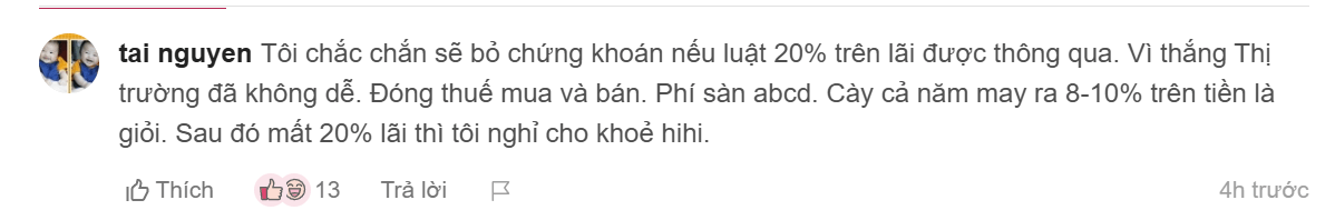 Nhiều nhà đầu tư phản ứng mạnh với đề xuất đánh thuế 20% trên lãi chứng khoán. Họ cho rằng mức thuế này quá cao, nhất là trong bối cảnh thị trường chưa ổn định.