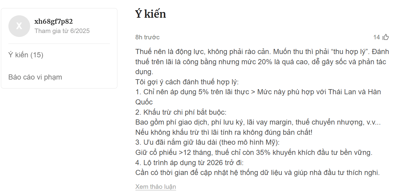 “Nếu áp thuế cao, dòng tiền sẽ chảy sang vàng, nhà đất hoặc gửi ngân hàng. Khi đó, thị trường chứng khoán càng khó phát triển”, một độc giả cảnh báo.