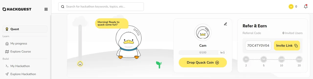 HackQuest chưa có airdrop chính thức nhưng triển khai hệ thống điểm thưởng qua quest, badge và NFT mint, xem như farm airdrop tiềm năng. Quack Program 2.0 cho phép kiếm Quack Coin qua check-in, nhiệm vụ nâng cấp và mint Quack Badge.