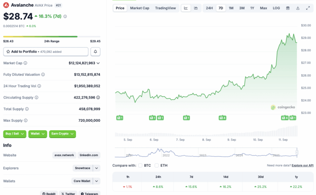 Avalanche (AVAX) tăng mạnh, +8,6% trong 24h và +25% trong tháng, vượt trội so với thị trường và lọt top 100 tài sản số theo vốn hóa.