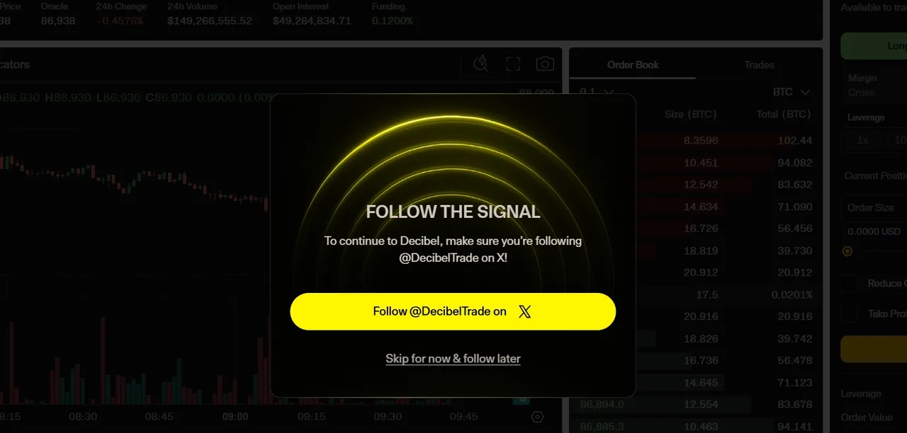 Bước 1: Truy cập vào https://app.decibel.trade/trade -> Connect ví và tài khoản X + Follow dự án