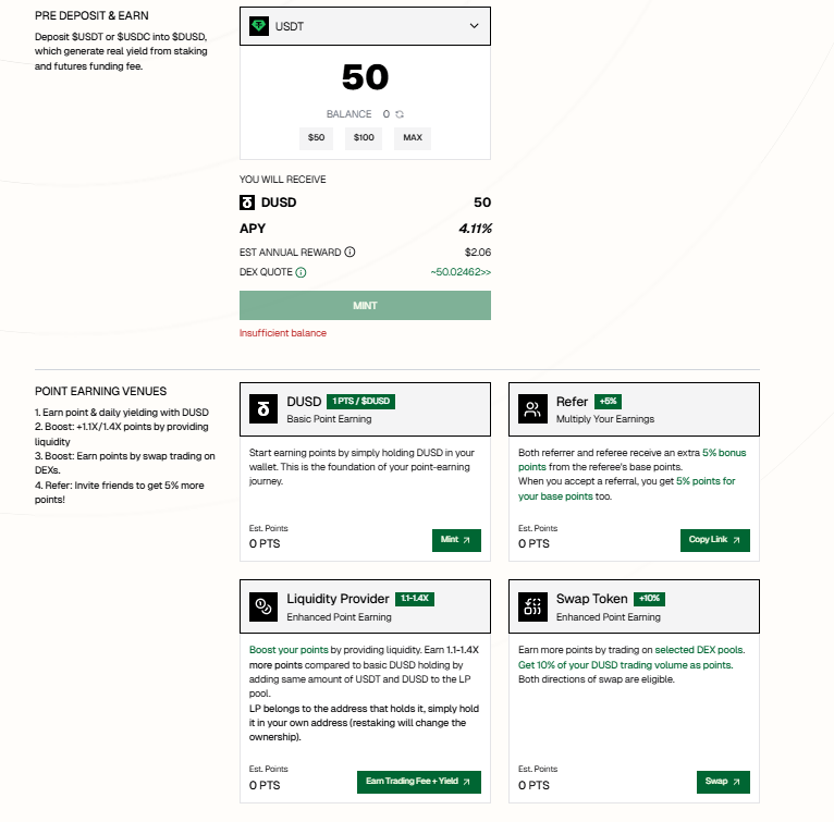 • DUSD – Stablecoin sinh lời tự động: Người dùng nhận lợi nhuận trực tiếp từ staking tài sản gốc và funding fee, không cần staking thủ công.